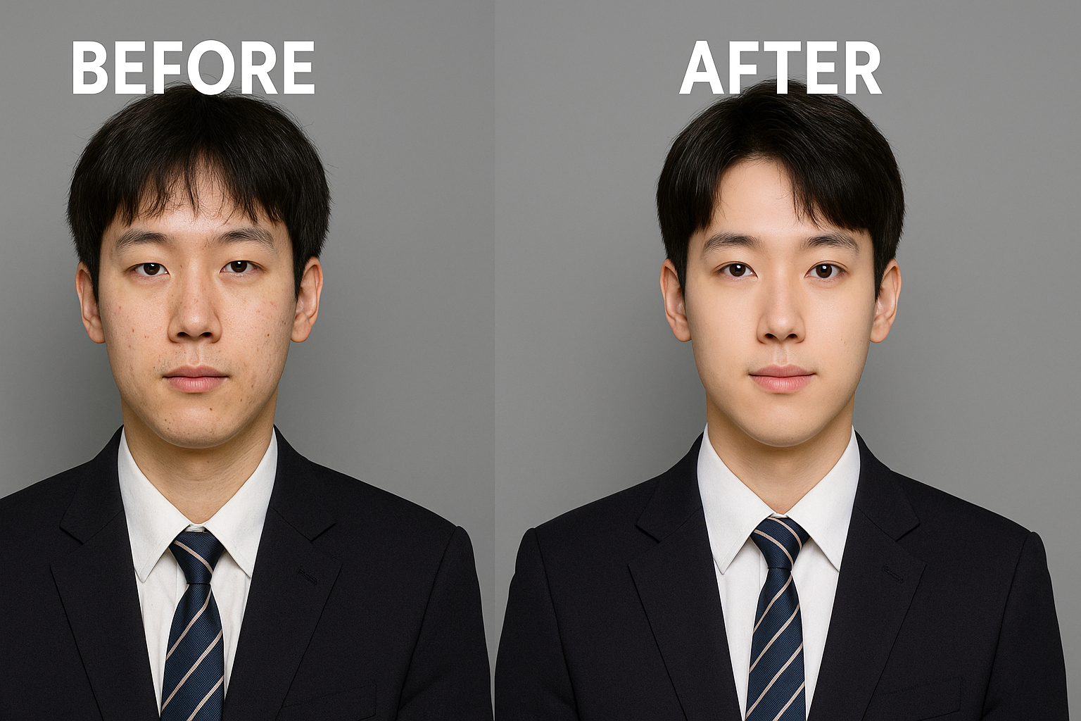 - 그림자 없는 밝고 깨끗한 얼굴은 보는 사람에게 단정하고 정직하며, 높은 신뢰감을 줍니다. 특히 취업사진이나 신분증 사진처럼 '첫인상'이 중요한 증명사진에서 매우 유리하게 작용합니다.