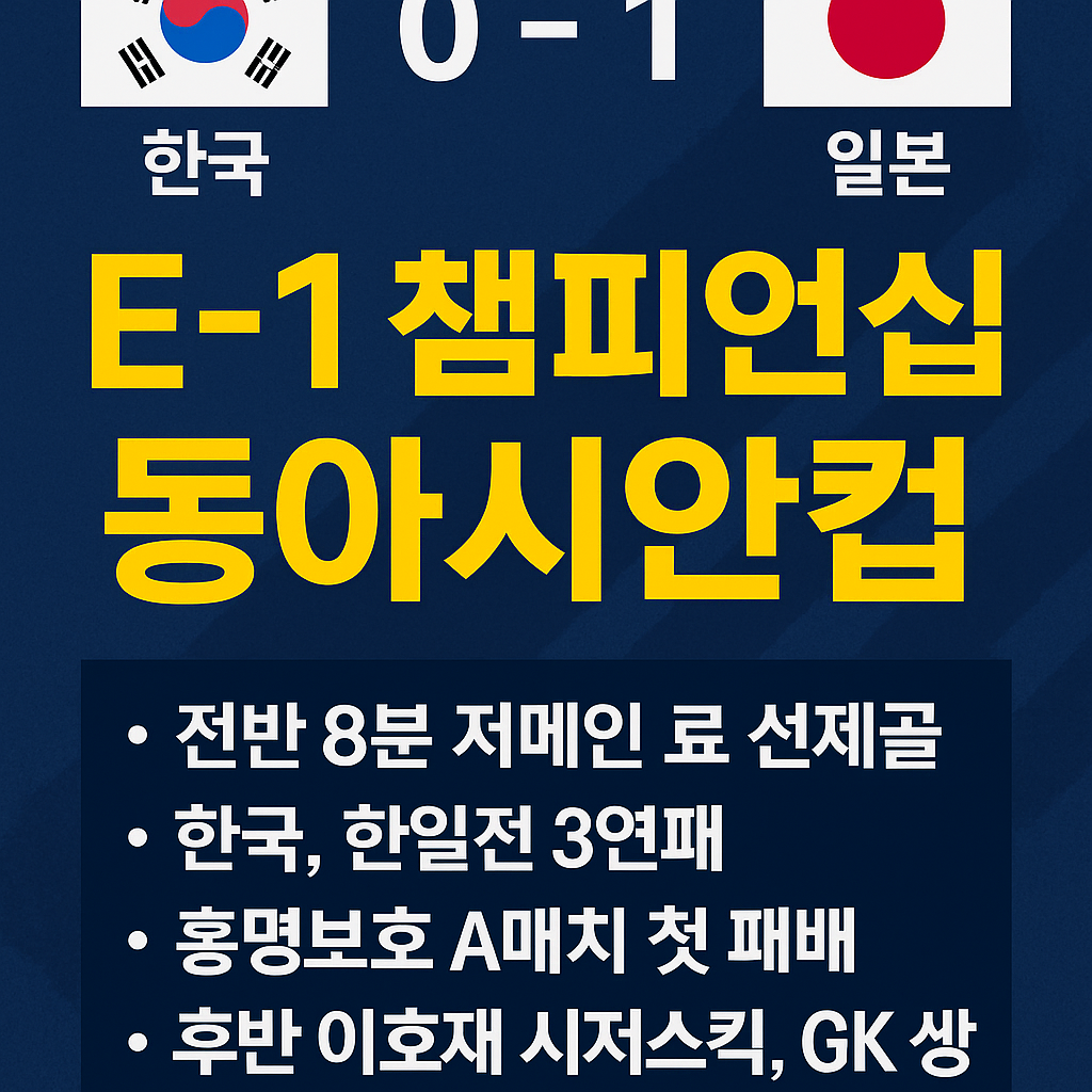 2025년 7월 15일, 경기도 용인 미르스타디움에서 열린 2025 동아시아축구연맹(EAFF) E-1 챔피언십 남자부 최종 3차전에서 대한민국 축구대표팀이 일본에 0-1로 패배하며 안방에서 우승컵을 일본에 넘기고 말았습니다. 이로써 한국은 2승 1패(승점 6)로 대회를 마무리했고, 3전 전승(승점 9)을 거둔 일본이 우승을 차지하며 대회 2연패 및 통산 3번째 정상에 올랐습니다.